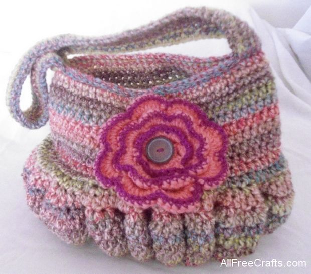 This crocheted hobo bag is roomy and practical with lots of feminine flair. Plump, rounded ripples along the bottom soften the style while also expanding the base. The optional crocheted flower can be used to repeat and emphasize favorite colors from a variegated yarn, or to add a contrasting note.