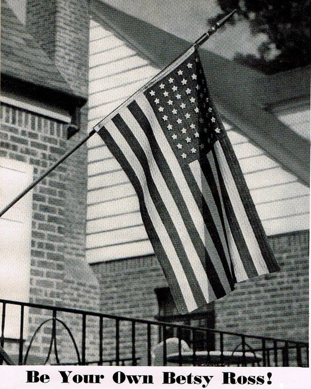 BAND… Cut a strip of heavy White material, 2½ x 25 inches. Bind back edge of Flag with this strip. Cut a ¼ inch eyelet, 1 inch from ends of band, and overcast with over-and-over sts. Block Flag to measure 24 x 36 inches.