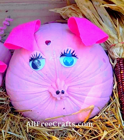 The pumpkin or squash stem makes an ideal snout. Add two black dots for nostrils using a marker or paint. If the stem is short, glue on a small felt circle or a painted button to form a nose. If the stem is non-existent, cut a segment from an egg carton, paint pink, glue to the pumpkin or squash then add the details.