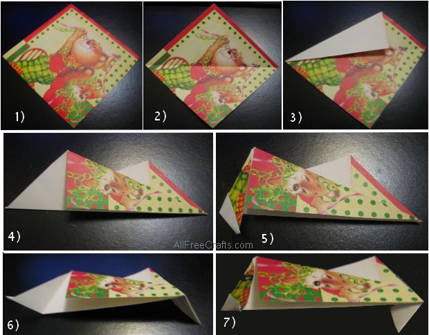 - Measure and cut a base square from the front of a Christmas card. Until you are familiar with the process, it’s best to start with squares of 4 inches or larger for easier folding.