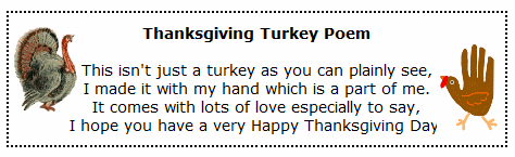 If you’re making a poster or a Thanksgiving card with your turkey hand print picture, then you could also include the Thanksgiving Turkey Poem shown here. The version at the bottom is available to print alone (just click on the poem framed by dots to print it out).